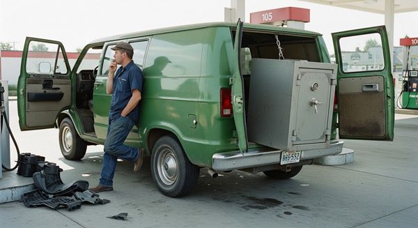 Ed, needing to get to another job, made a quick call to the office for backup and took off, leaving Ron to hold down the fort. Ron lit another cigarette, leaned against the now-curbed van, and calmly watched the safe hanging half out the back like it was no big deal.